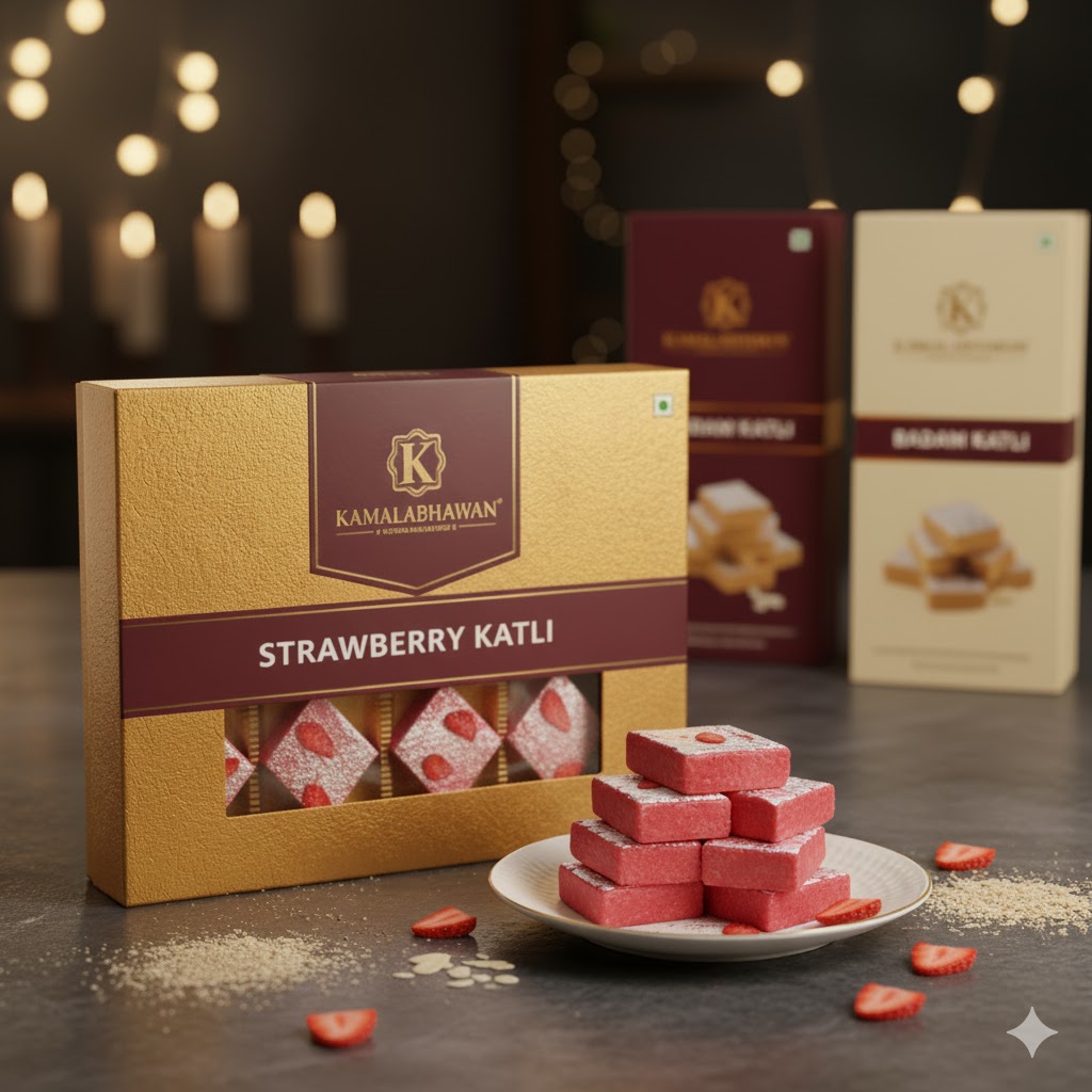Experience a refreshing twist on traditional Indian mithai with Strawberry Katli, a unique fusion sweet made from premium cashews blended with natural strawberry flavour. Smooth, vibrant, and irresistibly soft, this Katli brings together the richness of cashews and the fruity sweetness of strawberries in every bite. Its appealing colour, aromatic fragrance, and melt-in-the-mouth texture make it a favourite among both kids and adults.